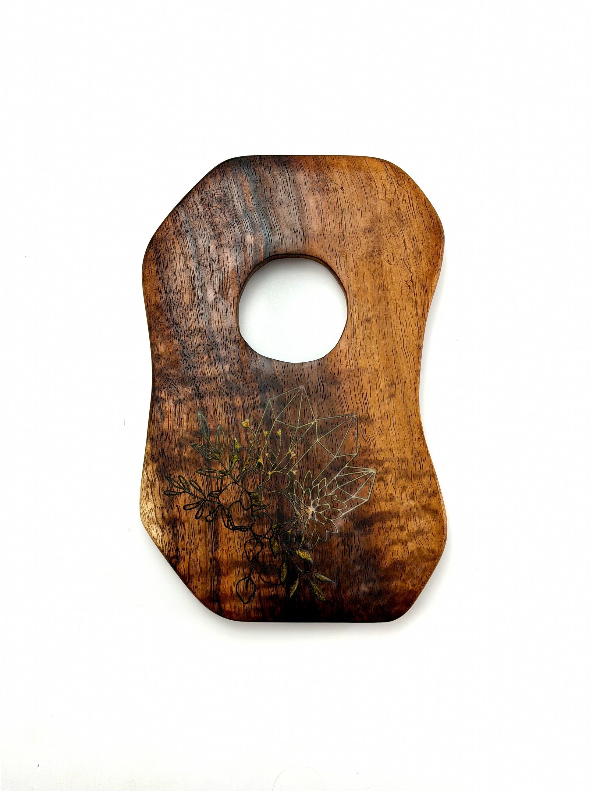 Engraved with geometric quartz crystals and wild botanicals, it’s designed as a grounding surface for rituals, objects, or daily practices.