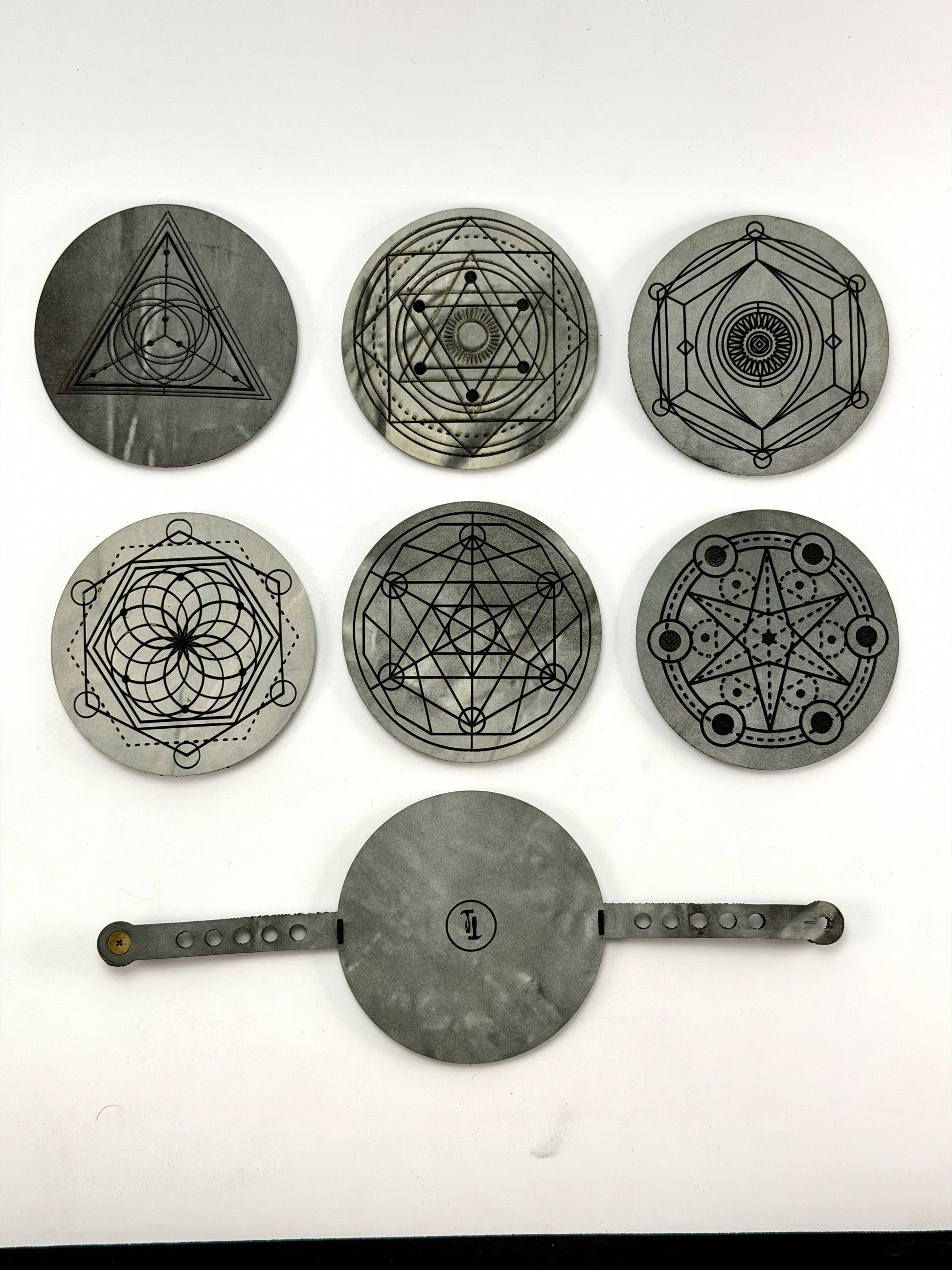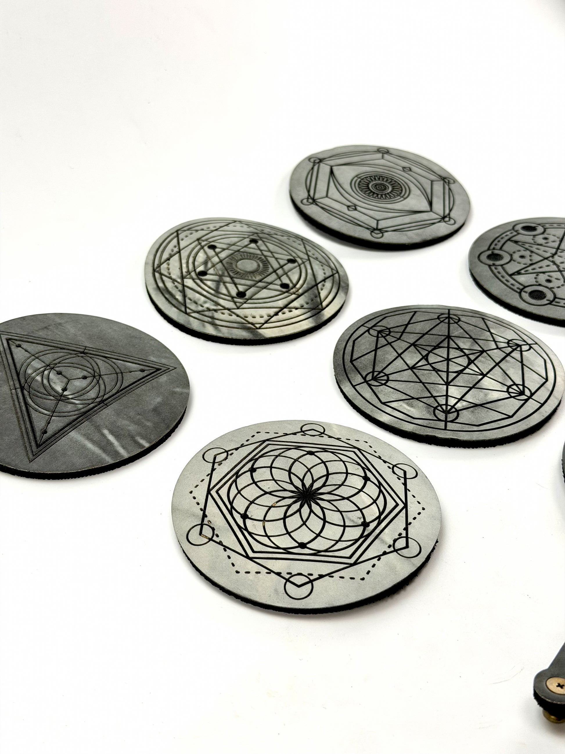 Each coaster features a unique sacred geometry engraving on a grey + black marble-patterned surface. Designed for camping, festivals, yoga studios, and everyday home use — protective, portable, and intentional.